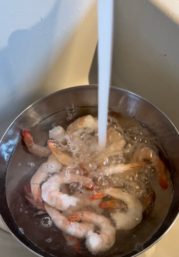 - Prepare the shrimp: Place 200g of frozen shrimp in warm water and let them sit for 5-10 minutes to thaw. Once thawed, drain off the excess water.