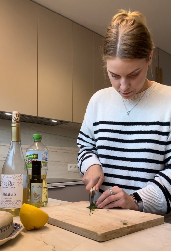 - Przygotowanie składników: Posiekaj garść świeżej pietruszki (ok. 30g). Obierz 2 ząbki czosnku i posiekaj. Pokrój papryczkę chilli, w zależności od preferencji co do ostrości. Sprawdź ostrość papryczki, aby uniknąć zbyt pikantnego dania. Pamiętaj, aby po tym dokładnie umyć ręce.