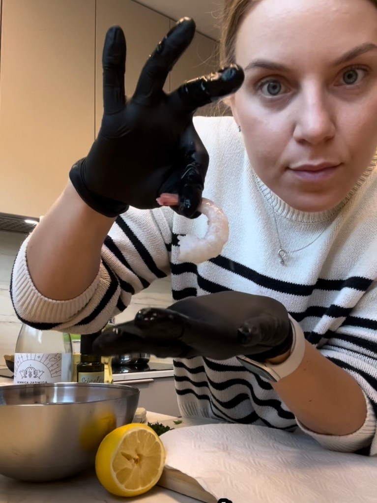 - Obieranie krewetek: Urwij ogonki krewetek, naciskając lekko na ich końcówki – w ten sposób łatwo je obierzesz. Upewnij się, że krewetki są całkowicie oczyszczone.