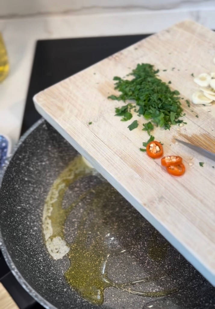 - Smażenie czosnku i chilli: Na dużej patelni rozgrzej 2 łyżki oliwy z oliwek (ok. 30ml), dodaj 1 łyżkę masła (ok. 30g) oraz 1 łyżkę oleju (ok. 15ml). Wrzuć posiekany czosnek oraz papryczkę chilli. Smaż przez 1-2 minuty, aż czosnek zacznie się złocić, a aromaty się uwolnią.