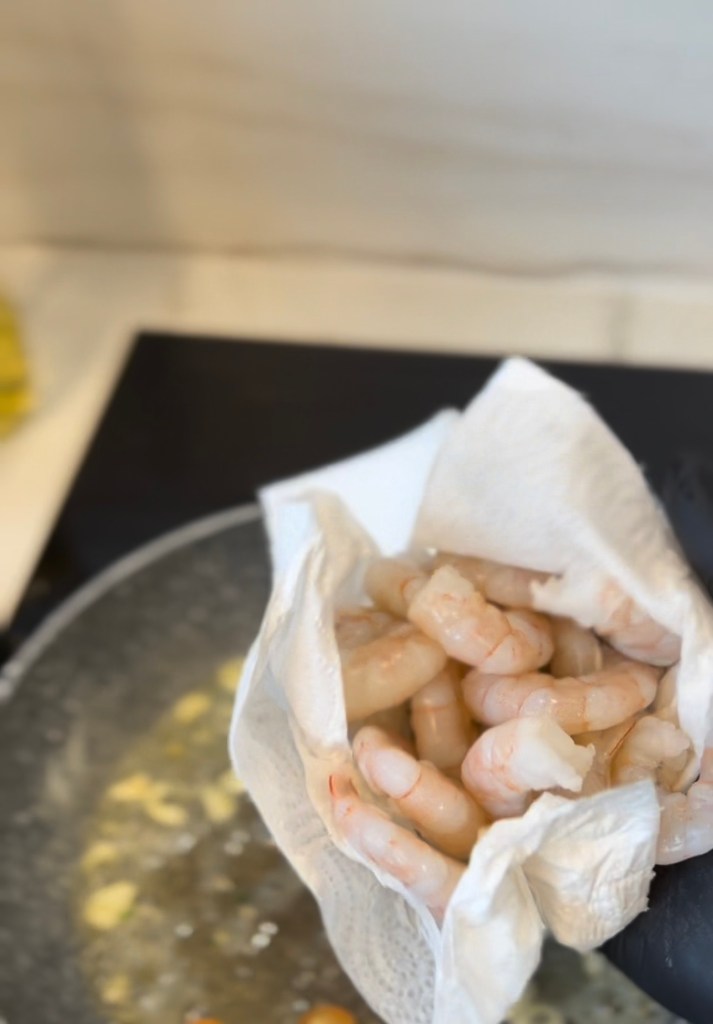 - Przygotowanie krewetek: Mrożone krewetki zalej ciepłą wodą i odstaw na 5-10 minut, aby się rozmroziły. Następnie odciśnij je z nadmiaru wody.