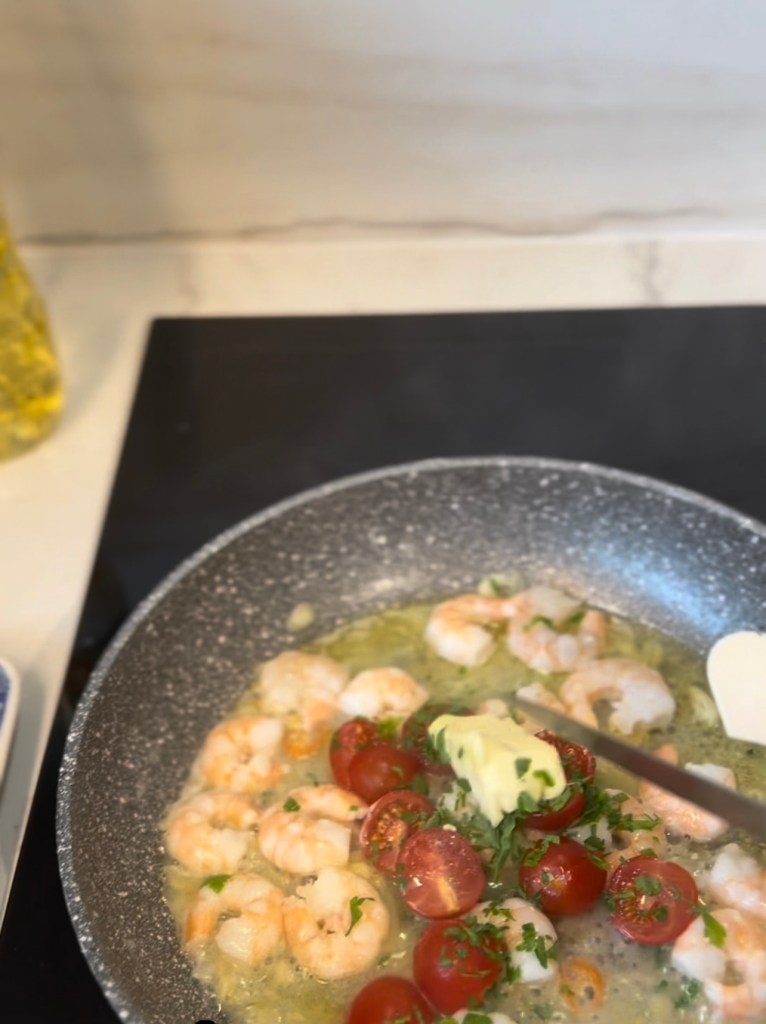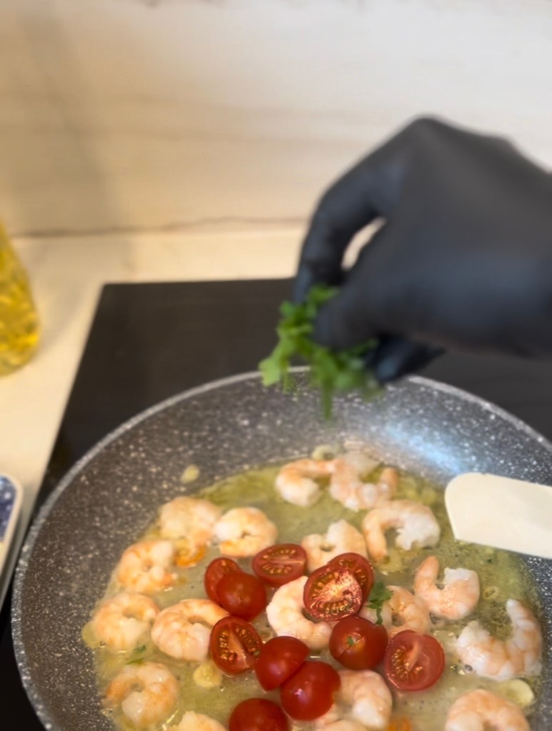 - Wykończenie dania: Wyłącz kuchenkę, dodaj kolejną łyżkę masła (ok. 30g) i garść posiekanej pietruszki (ok. 30g). Wrzuć ugotowany makaron do krewetek na patelnię i delikatnie wymieszaj, aby makaron dobrze pokrył się sosem.