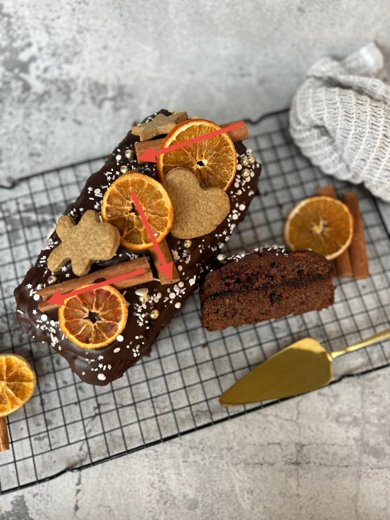 Zamiast dzielenia na strefy, wyznaczam punkty w zygzakowaty sposób na całej powierzchni ciasta. (najlepiej jak będzie to coś prostokątnego, jak laska cynamonu, czy prostokątne ciasteczko, lub parę ozdób w jednej linii) - Budowanie dekoracji